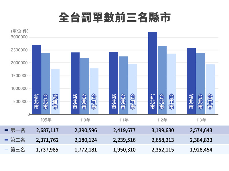 強力執法下,台灣交通變好了嗎?從各縣市開出的罰單數來看,雙北蟬聯五年冠亞軍,台中則是連續四年名列第三,但分析交通事故件數,僅北市111年起微幅下降,新北不減反增,而台中在112年更是一口氣暴增27萬件,且連續兩年事故件數高居全台之冠。