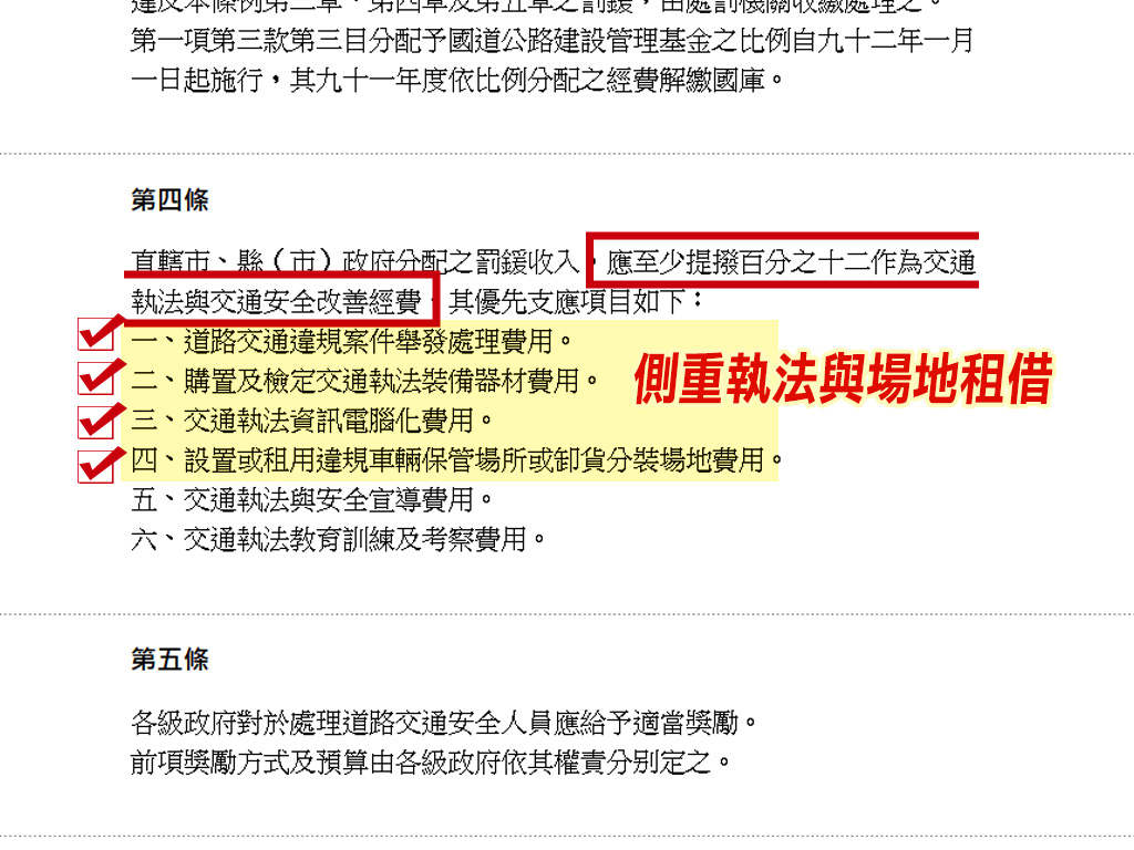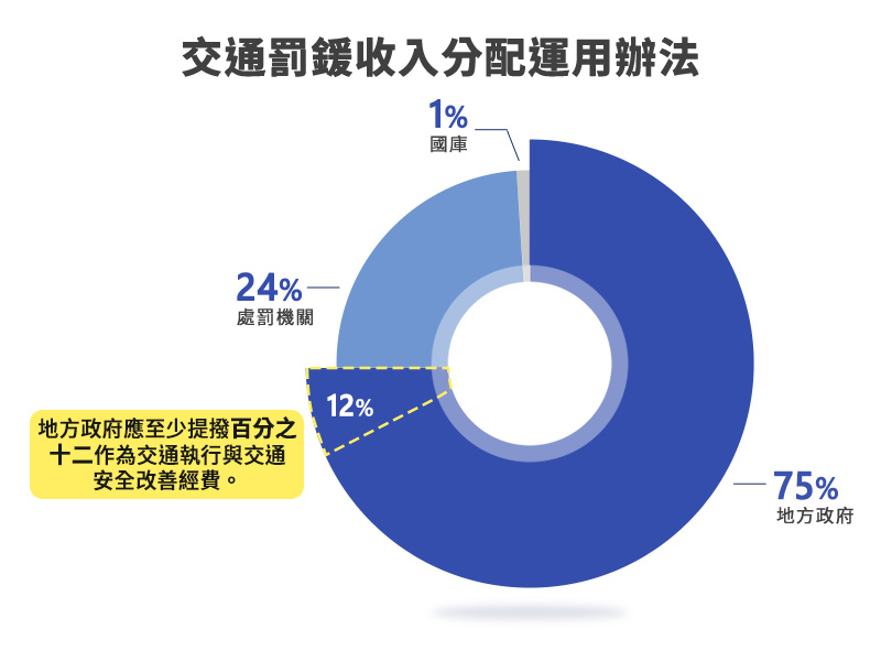 依據「道路交通違規罰鍰收入分配及運用辦法」,由各縣市政府舉發的案件,經處罰機關收繳後,75%將分配予縣市政府,而當中「應至少提撥12%做為道安改善經費」,換言之,最高恐達88%用在哪「管不著」。且運用辦法只規定六大「優先項目」,缺乏強制力,內容更有半數側重「執法」,交通宣導與工程改善相對被忽視!
