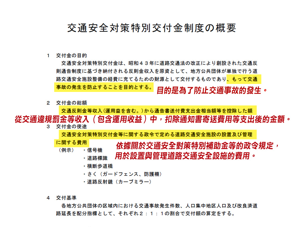 台中市議員日本「交通安全對策特別交付金制度」,明確定義出,「補助金」目的是為了防止交通事故,而非側重執法強度與工具,且扣除通知書寄送等支出費用後,即全數用在設置與管理道路交通安全的設施。